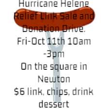 According to a public notice, "'Two County Community Disaster Relief Team' is collecting donations and going to lend a hand. This is a collaboration of people from Newton and Jasper Counties. On Friday, October 11th we will be having a link sale and a donation drop off on the square at Newton in front of Agape Christian Academy".